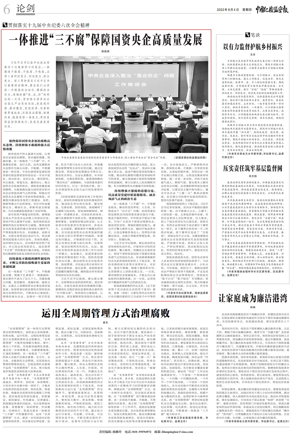 ¡¶Öйú¼Í¼ì¼à²ì±¨¡·¿¯·¢³Â³¬Ó¢ÊðÃûÎÄÕ£º Ò»ÌåÍÆ½ø¡°Èý²»¸¯¡±°ü¹Ü¹ú×ÊÑëÆó¸ßÖÊÁ¿Éú³¤